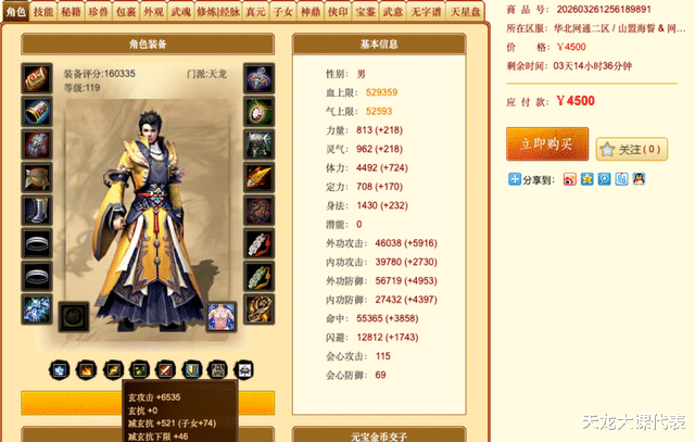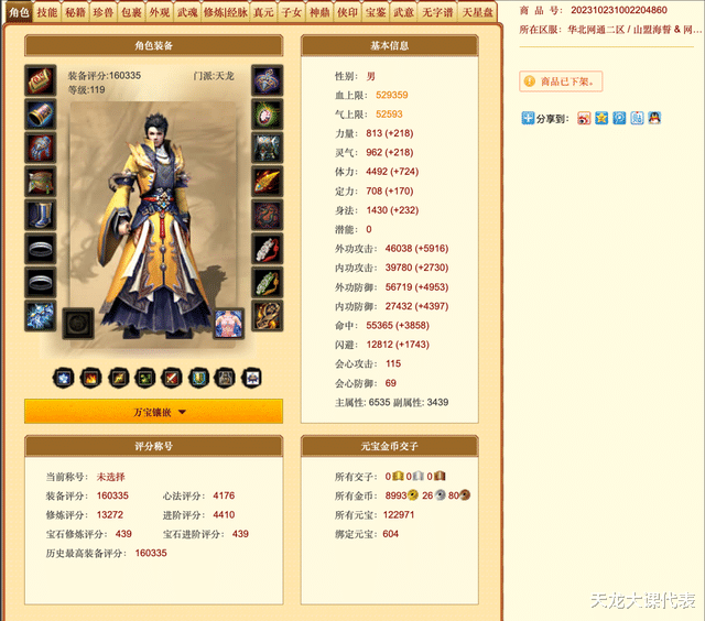 今天给全球先容的,是来自【锦绣中华】做事器的16万评分的119级天龙,售价4500元(当今仍是找不到了,省略率是卖掉了),面板不错忽略不计:
