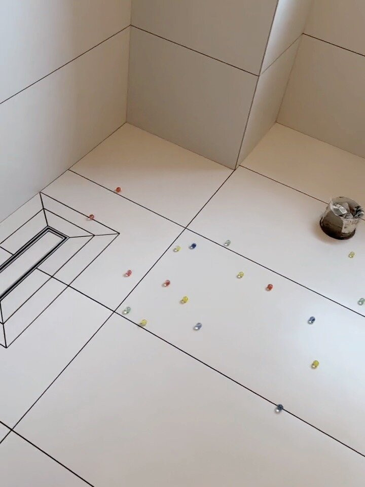 坡度没找好——地漏在最高点,水往门口流,这画面太好意思不敢看。