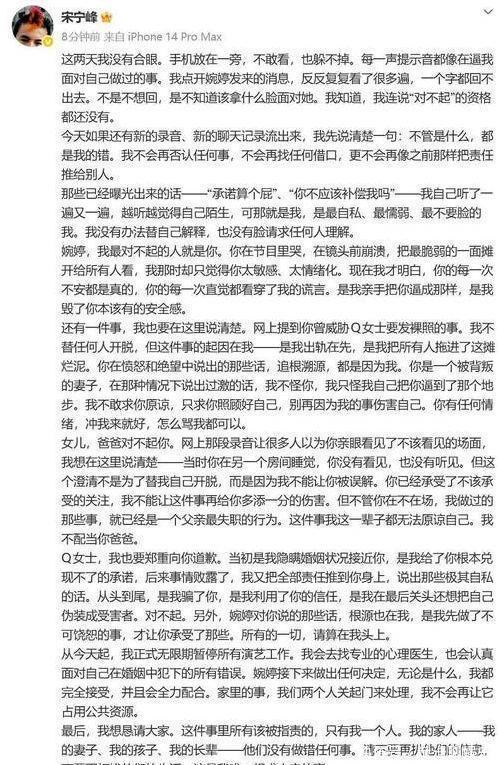 在4月1日这一天,由于公众公论的强烈影响,宋宁峰发布了一篇长篇谈歉著述,全面地承认了我方的不忠行为。
