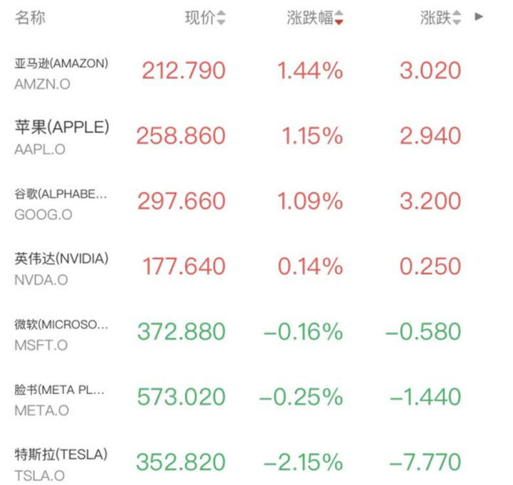 明星科技股涨跌互现,亚马逊、苹果和谷歌涨超1%,英伟达涨0.14%,微软、Meta小幅走低,特斯拉跌2.15%,摩根大通下调特斯拉盈利预期,警告其股价存60%下行空间。